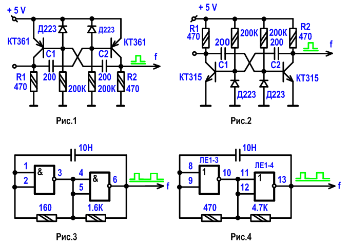 Для мультивибраторов на транзисторах рис.1, рис.2 выходная частота зависит от номиналов резисторов R1, R2, конденсаторов С1, С2, а при R1 = R2 = R и С1 = С2 = С будет иметь форму меандра и расчитывается по формуле: f ≈ 2π√ 2 /RC, где все единицы в системе СИ. Мультивибраторы на выходах формируют импульсы со скважностью 2. Резисторы R1, R2 рис.1 не должны быть больше 470, 510 Ом чтобы формировались логические нули с сответствующими уровнями для последующих логических радиоэлементов. С номиналами резисторов и конденсаторов, указанных на схемах рис.1, рис.2, мультивибраторы формируют импульсы частотой 43 - 48 кГц.