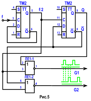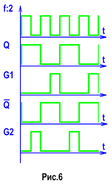 Мультивибраторы на логических элементах И-НЕ и ИЛИ-НЕ (рис.3, рис.4) не формируют импульсы со скважностью 2, поэтому после них необходимо поставить делитель на 2 на D-триггере. С номиналами резисторов и конденсаторов, указанных на схемах рис.3, рис.4, мультивибраторы формируют импульсы частотой 83 - 85 кГц. На рис.5 паказана схема формирователя фазовых сигналов для импульсных источников питания, а на рис.6 – эпюры импульсных сигналов ТТЛ уровней, где G1 и G2 – фазы этих сигналов (импульсы сигналов сдвинуты во времени на пол периода):