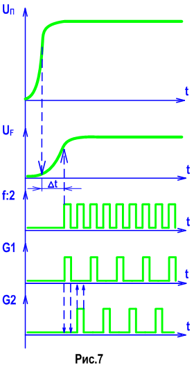 Особенностью такой схемы есть то, что когда формируется импульс на одном выходе, например G1, на другом выходе G2 в этот момент сигнала нет, низкий уровень. Когда высокий уровень сигнала упадет до нуля, логический нуль, наступает пауза и за тем формируется импульс на выходе G2, при этом на выходе G1 удерживается уровень логического нуля. Дальше импульсные сигнали G1, G2 от генератора фаз через усилители тока подаются на плечи импульсного источника питания. На рис.7 показана временная диаграмма работы генератора фаз для импульсных источников питания с момента подачи питания где: